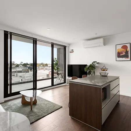 Stylish Apartment Near South Melbourne Market provides guests with the convenience of self-catering amenities, like an equipped kitchenette and an outdoor dining area for their enjoyment.